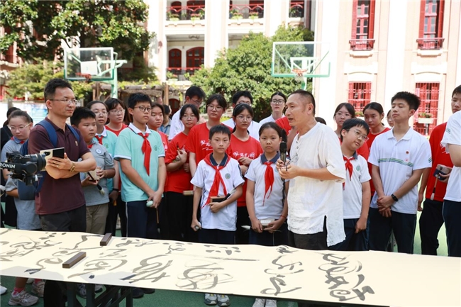 经过近半年积极筹划,2025年9月26日上午,光明中学举办了“翰墨光明 卷书臻途”智慧书法教室揭牌仪式暨“艺术一条龙”项目校书法长卷书写活动。著名书法家徐庆华教授受邀参与,与来自“艺术一条龙”项目布局学校的书法特长学生共同挥毫,以笔墨传承经典,展现了传统书法艺术的新时代魅力。